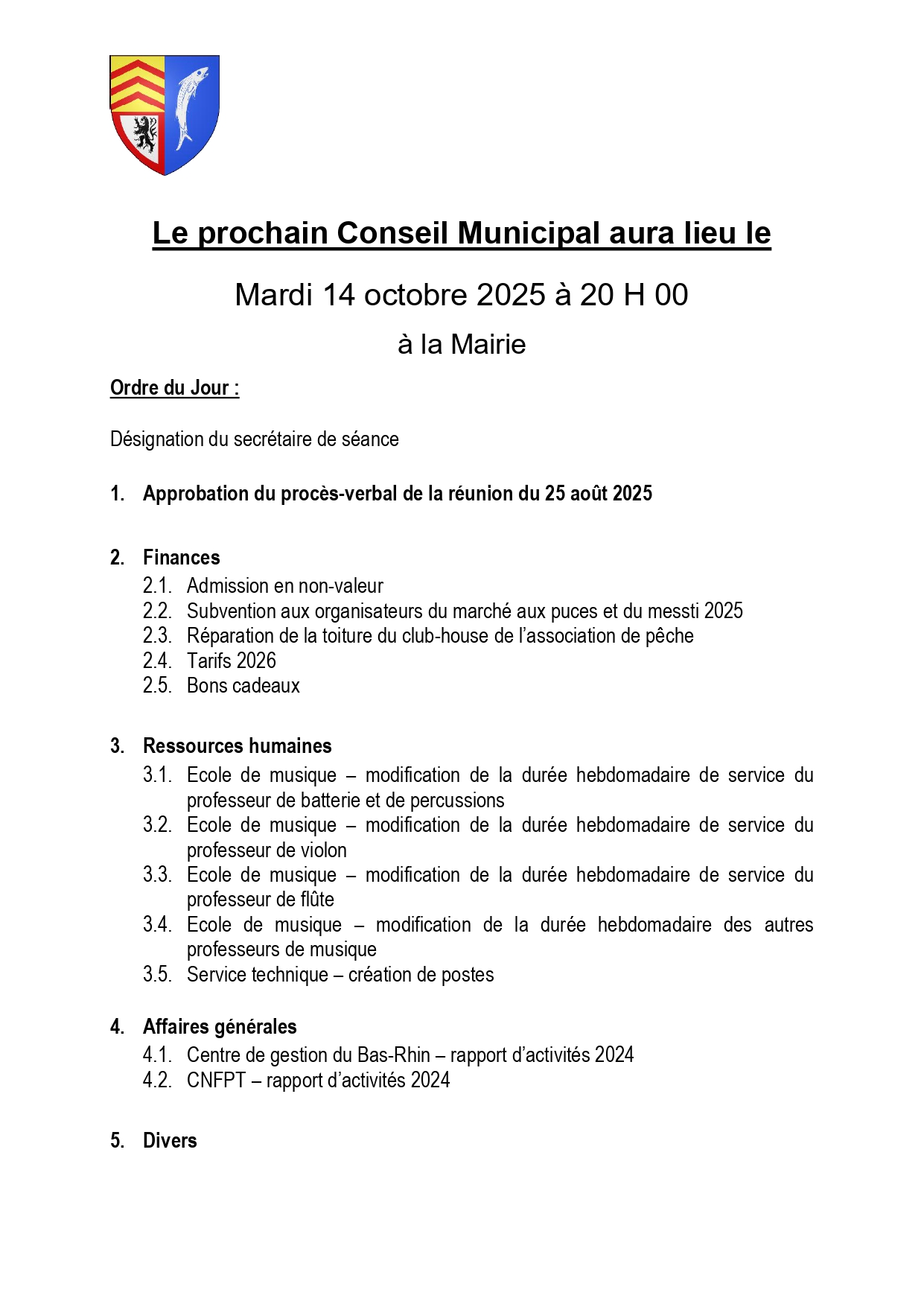 Le prochain Conseil Muncipal aura lieu le 14 octobre 2025 à 20 heures en salle des séances