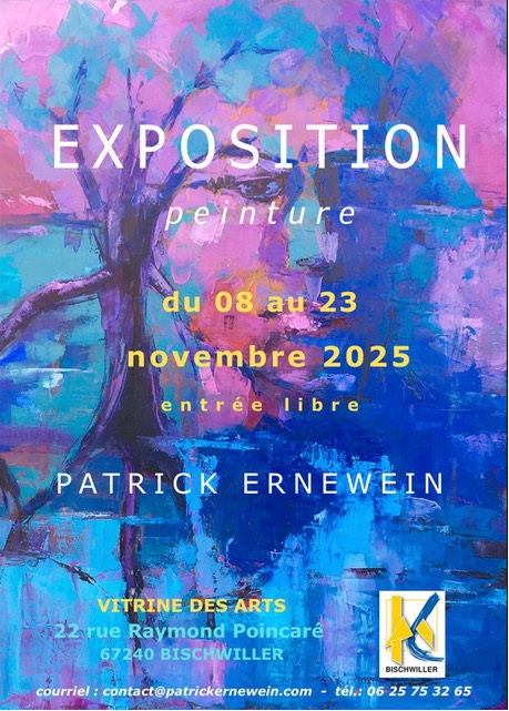 Artiste peintre, Patrick Ernewein est originaire d'Alsace. Il vit actuellement au Nord de Strasbourg dans un village du bord du Rhin, Offendorf. Il a participé à diverses expositions et salons et expose régulièrement. Ses créations sont inspirées par les paysages d'eau et les réminiscences de ces voyages. Son travail pictural est un hommage à la beauté de ces environnements, il est réflexion sur l’harmonie fragile entre le monde naturel, l’eau, la lumière, l’humain, l’invisible et l’inconnu. Vitrine des Arts à Bischwiller. Ouvert du Samedi 08 au dimanche 23 novembre 2025. Horaires: les vendredis de 15h00 à 19h00, les samedis de 14h00 à 18h00 et les dimanches de 10h00 à 12h00 et 14h00 à 17h00.