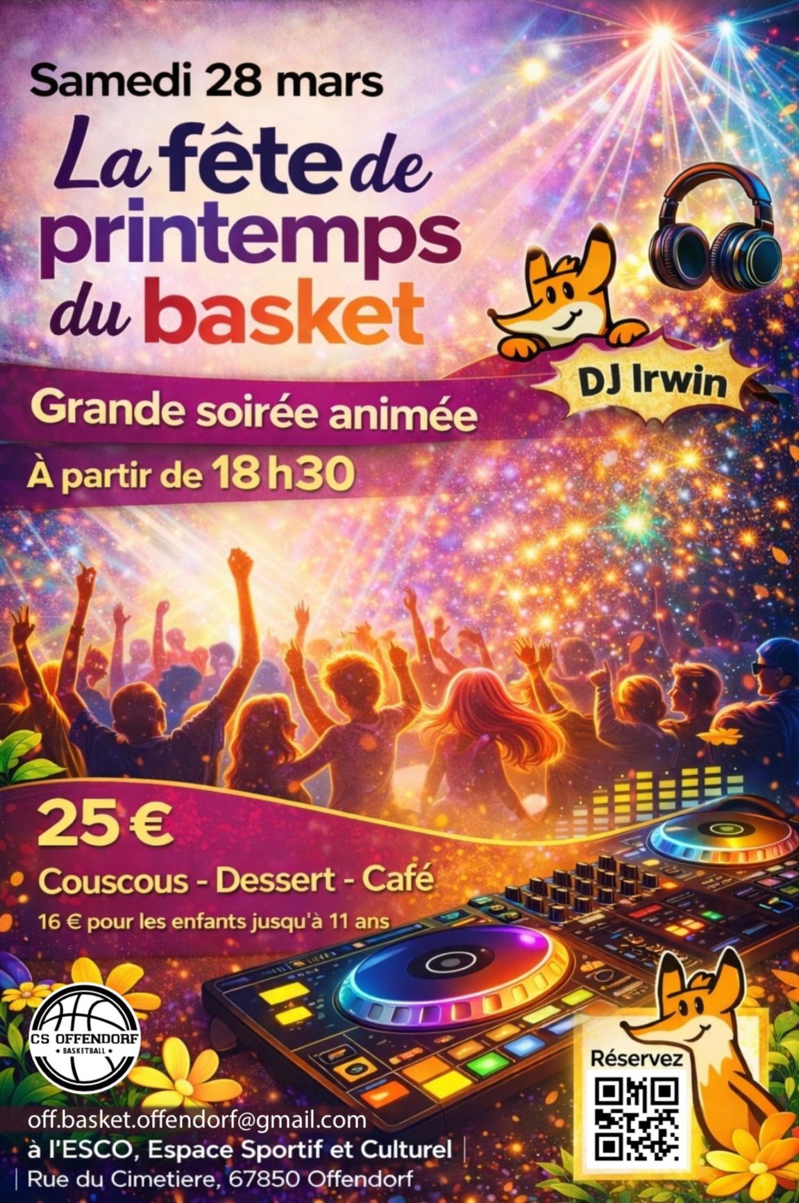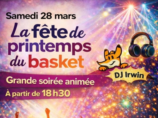 Le 28 mars 2026 venez à la grande soirée animée pour la fête de printemps du basket à partir de 18h30 à l'ESCO.