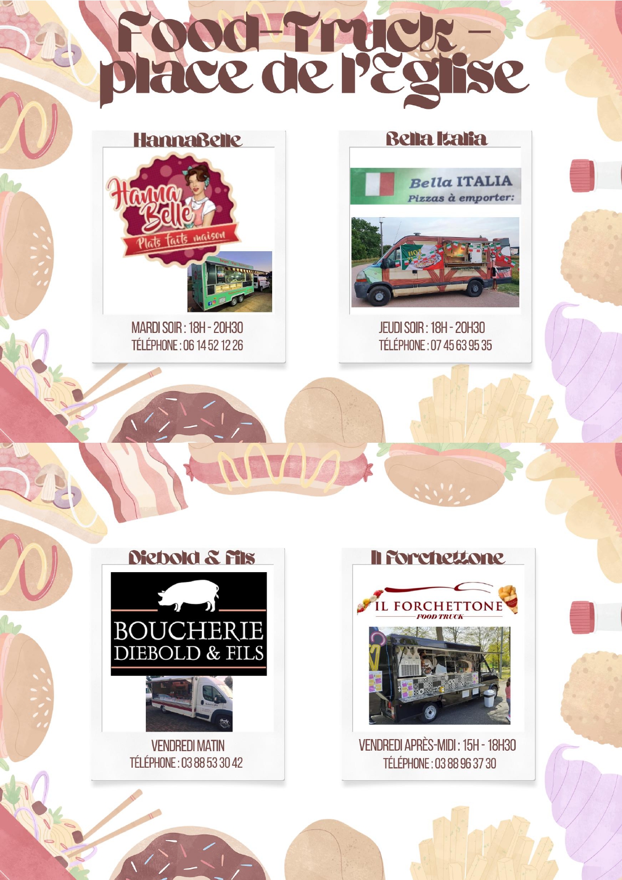 Voici le planning de venue des food-trucks présents place de l'église au courant de la semaine :